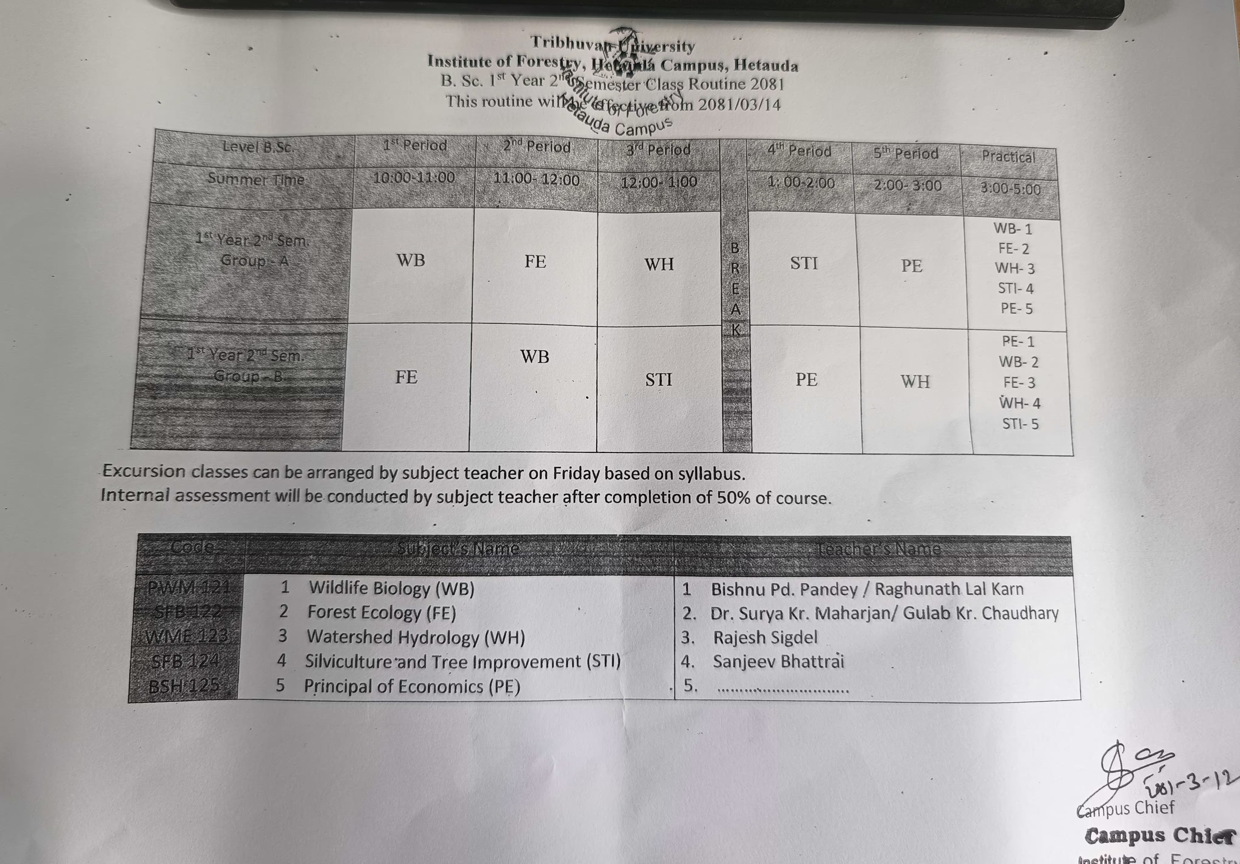 B.sc 1st Year 2nd Semester Class Routine 2081