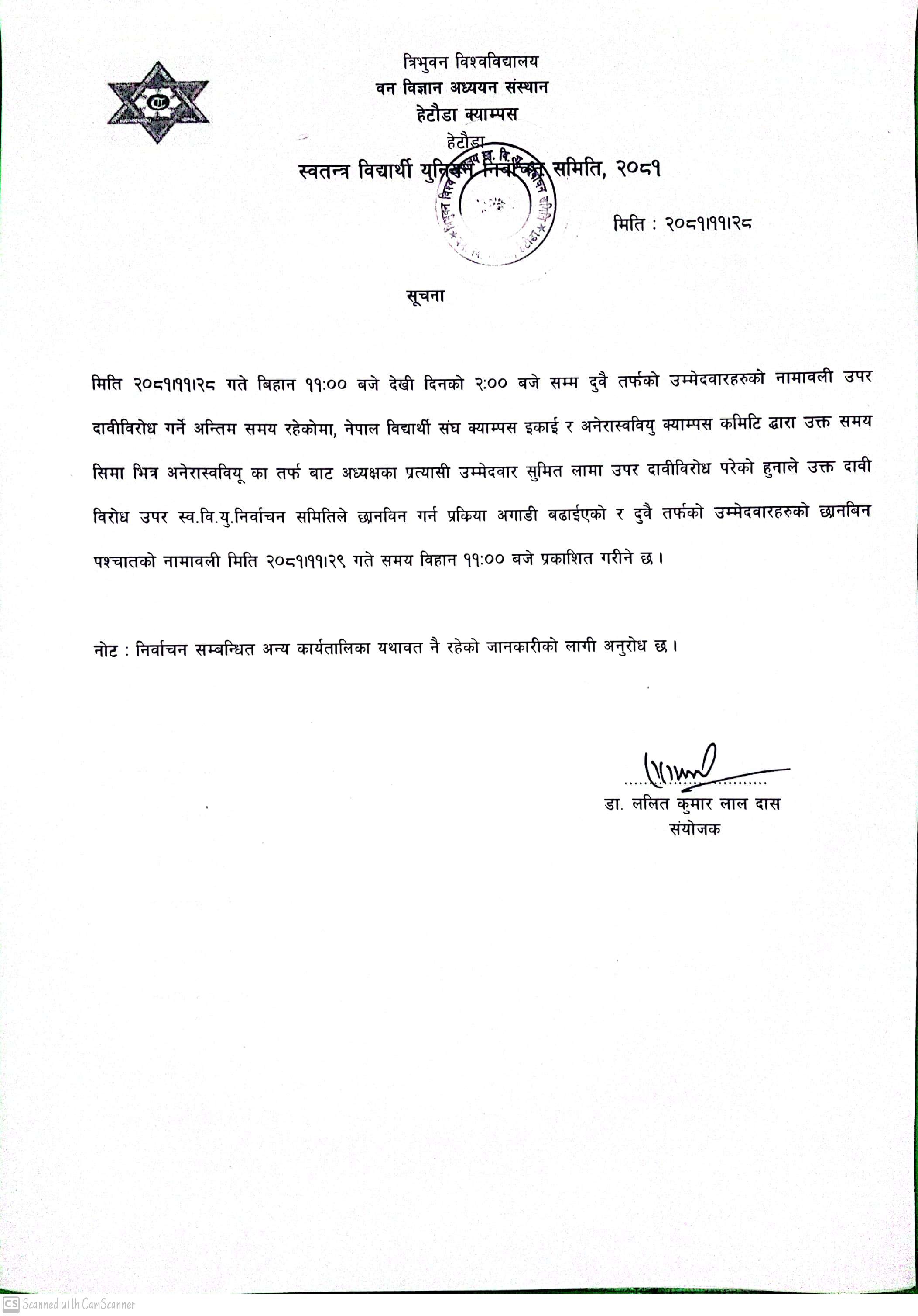 स्व. वि. यु. निर्वाचनको प्रत्यक्ष तथा समानुपातिक तर्फका उम्मेदवारहरुको नामावली उपर दावी बिरोध सम्बन्धी सूचना !!!