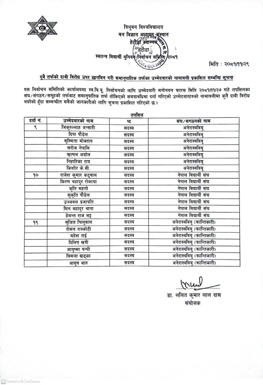 स्व. वि. यु. निर्वाचनको दावी बिरोध उपर छानबिन गरि समानुपातिक तर्फका उम्मेदवारहरुको नामावली प्रकाशन गरिएको सम्बन्धी सूचना !!!