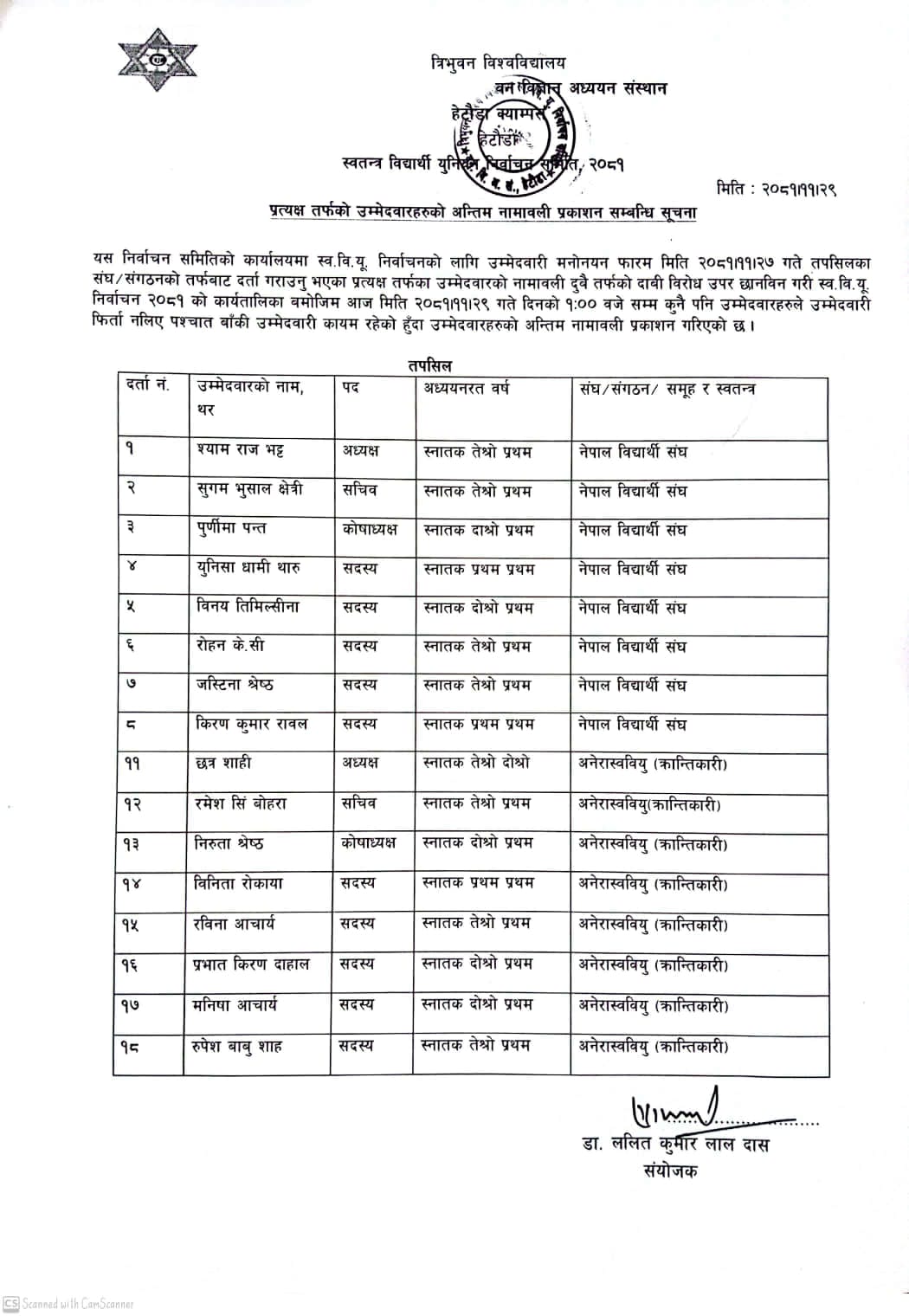स्व. वि. यु. निर्वाचनको प्रत्यक्ष तर्फका उम्मेदवारहरुको अन्तिम नामावली प्रकाशन गरिएको सम्बन्धी सूचना !!!
